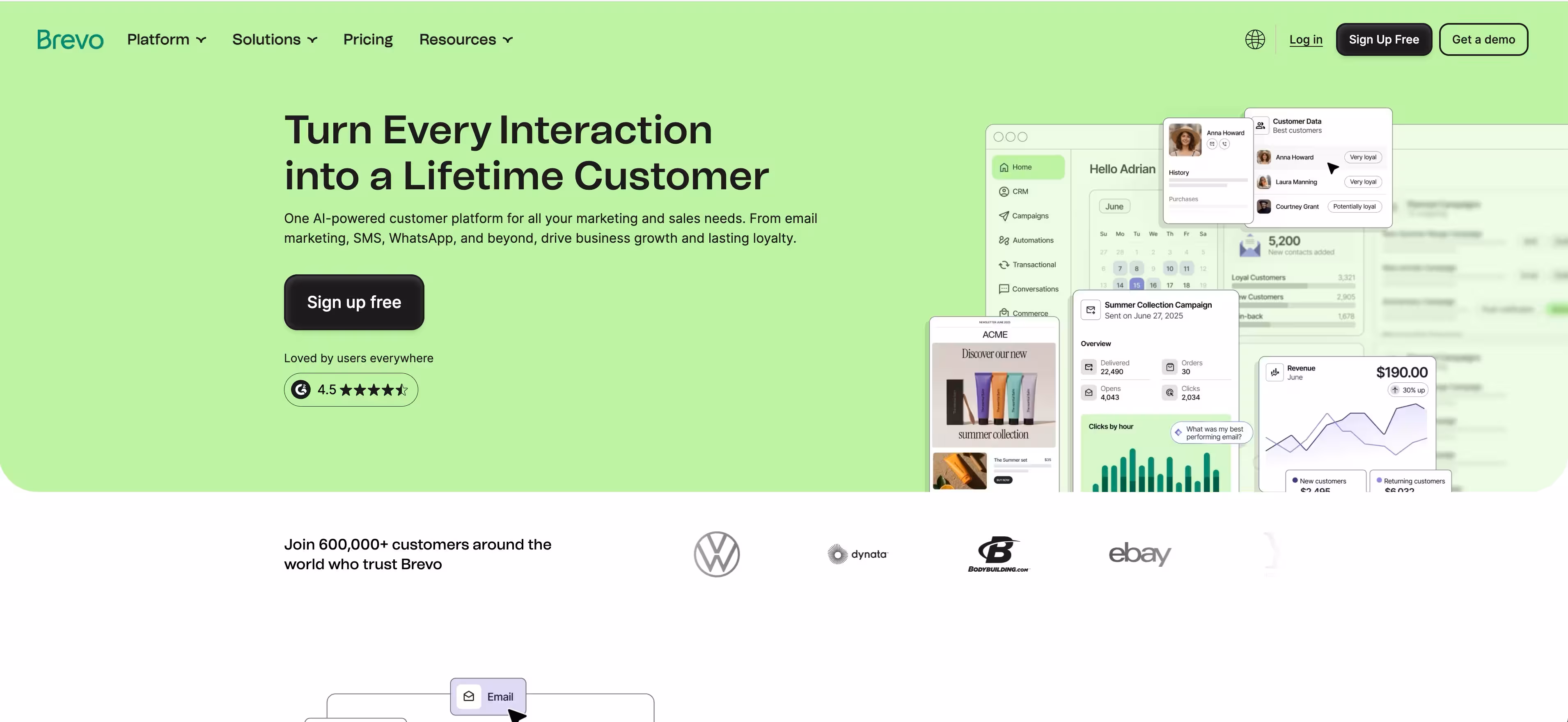 Brevo (formerly Sendinblue) stands out as an all-in-one marketing platform that combines email, SMS, and WhatsApp messaging with a built-in CRM. Unlike most competitors that charge per contact, Brevo prices based on email volume, which means you can store unlimited contacts without paying more.