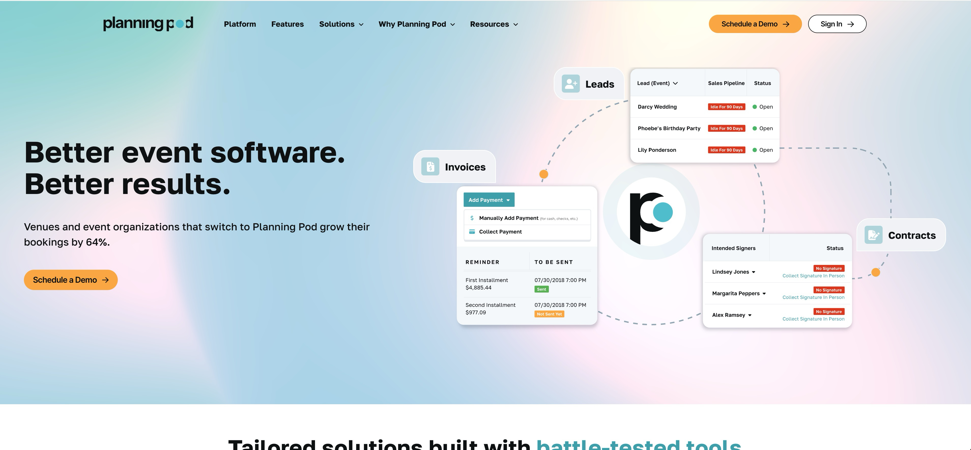 Planning Pod is an end-to-end venue and event management platform that combines over 20 tools into one system. The platform works best for venues and event businesses that need an all-in-one solution for CRM, contracts, floor plans, and invoicing.