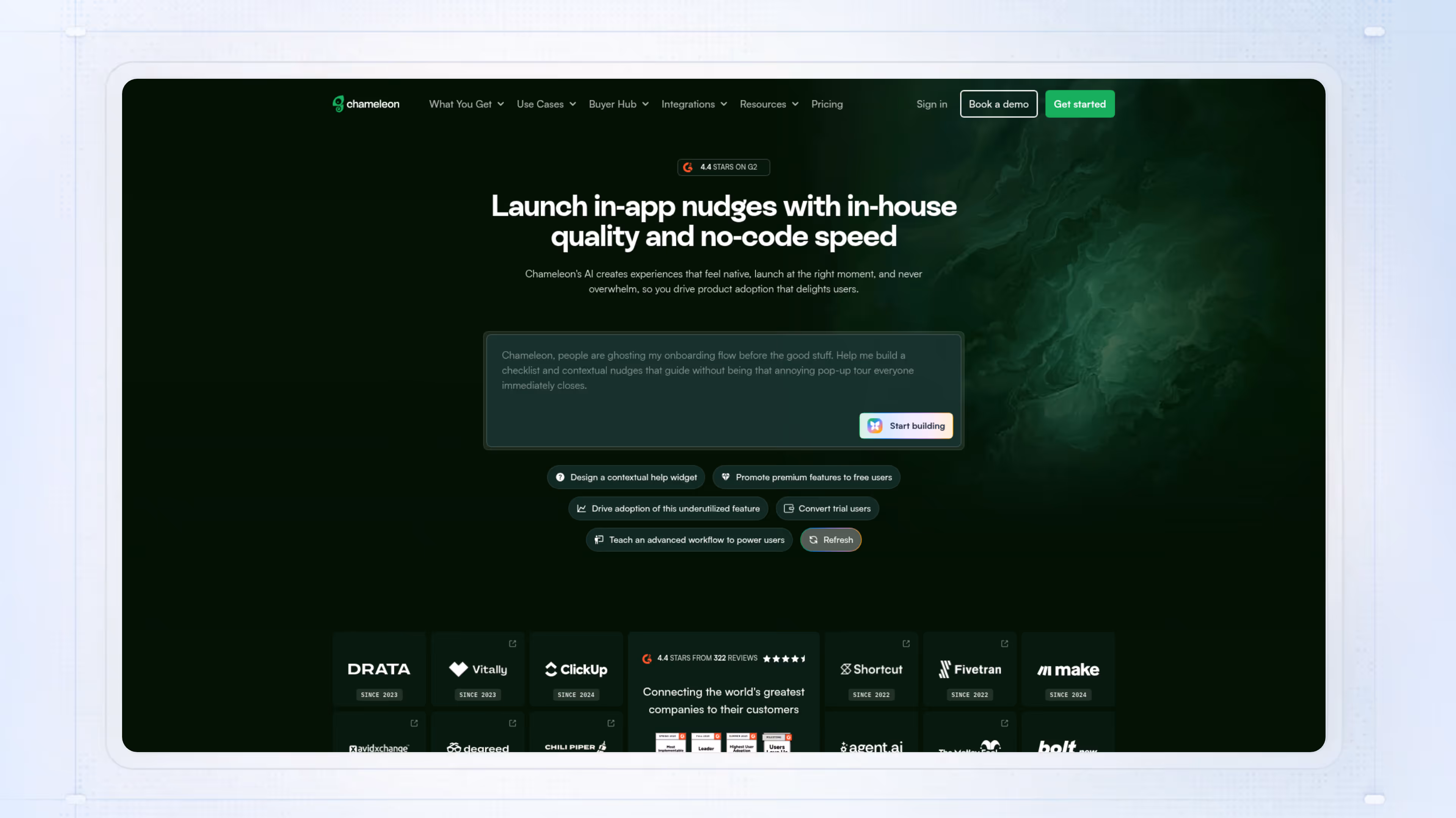 In-app messaging and tours with deep targeting options. Chameleon excels at showing the right message to the right user at the right time.