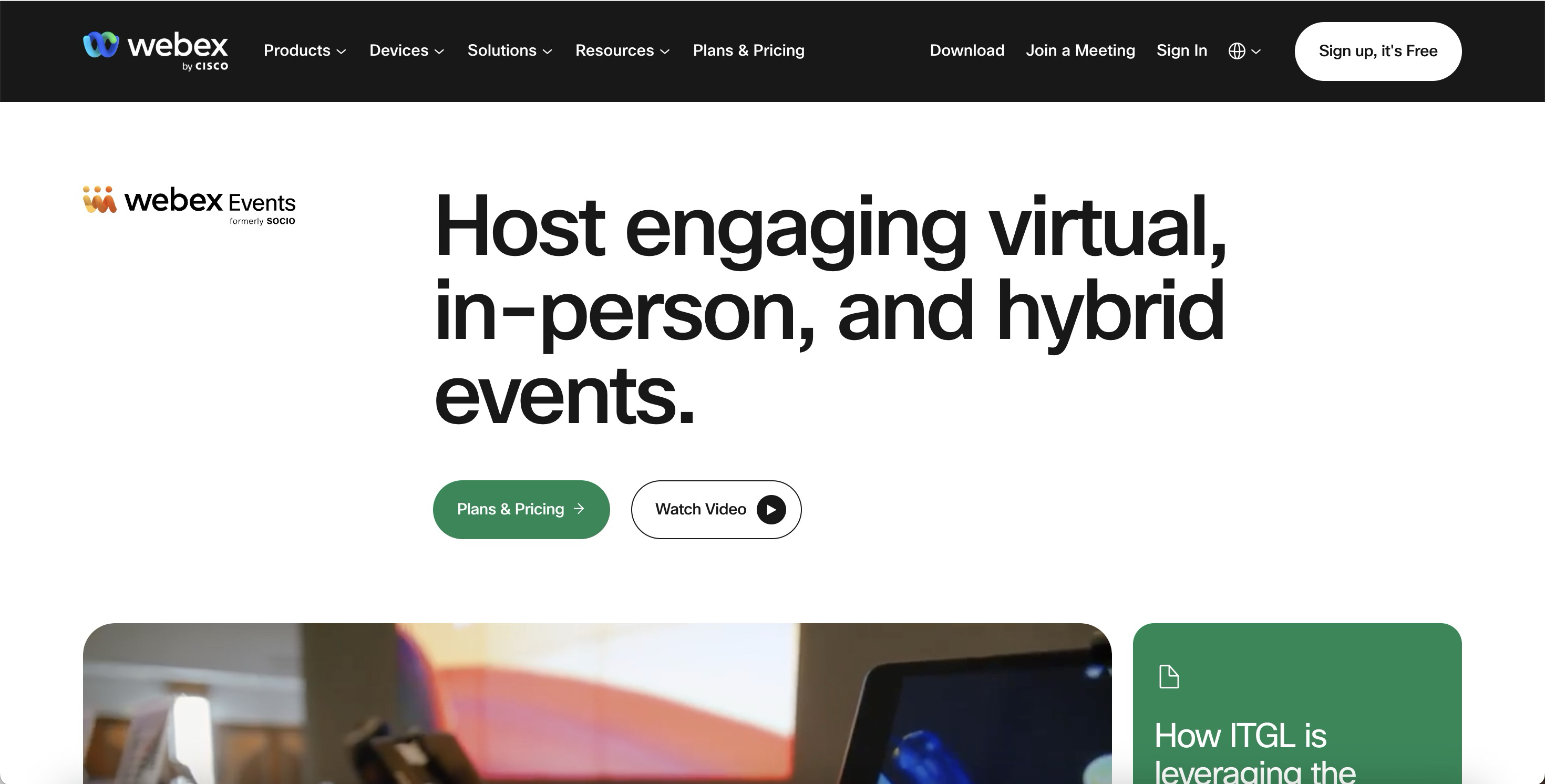 Webex Events (formerly Socio) is Cisco's enterprise-grade solution for virtual, in-person, and hybrid events. It combines a user-friendly interface with the security and reliability expected from Cisco.