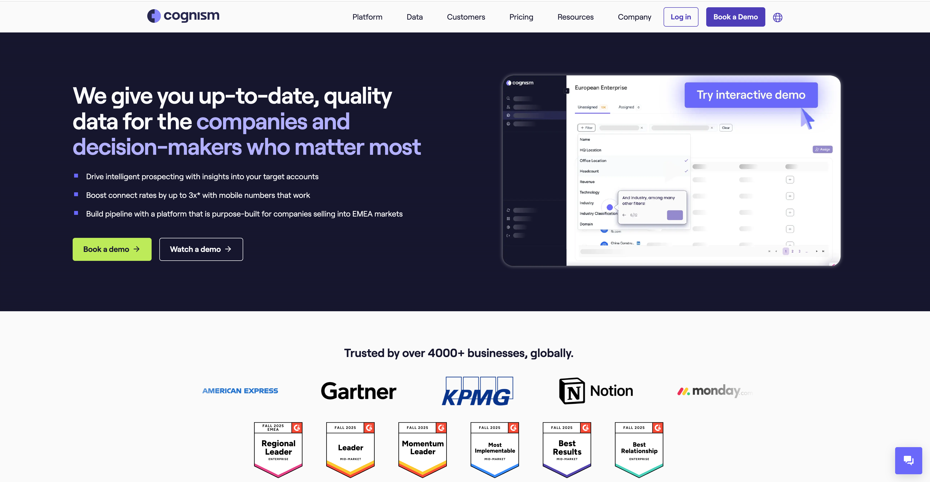 Cognism is a sales intelligence platform that combines intent data (via a Bombora integration) with a GDPR-compliant contact database. The platform has a strong focus on European markets.