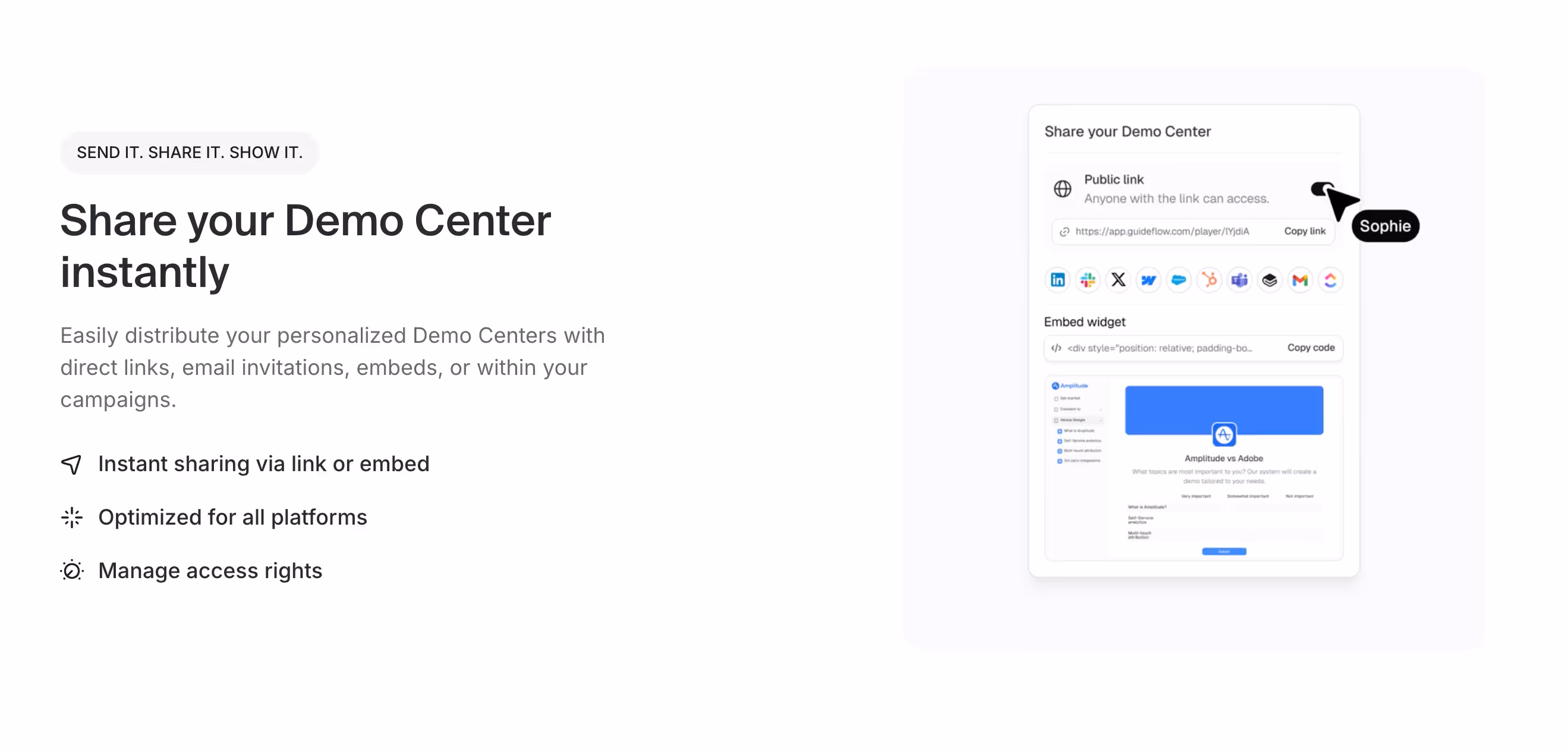 Distribute demo centers easily via shareable links, email invitations, embedded widgets, or campaign integration with advanced access controls enabling both public and private sharing.
