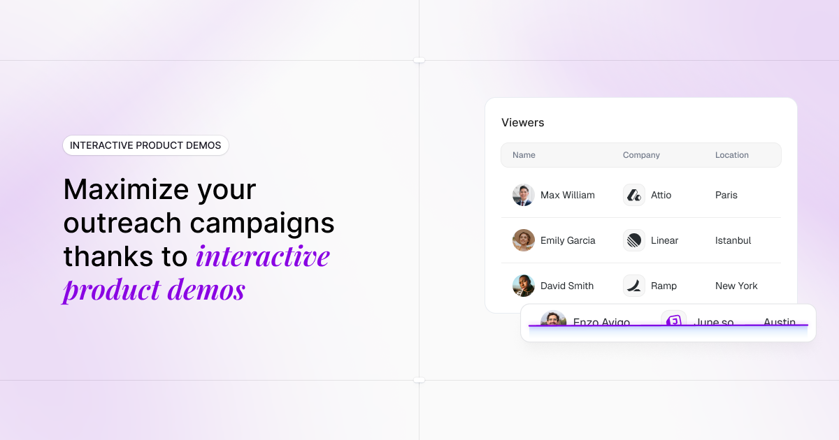 Track every interaction with your content: interactive demo completion rates, interaction patterns, time spent, drop-off points and click paths. Advanced analytics will surface qualification signals and optimization opportunities automatically.