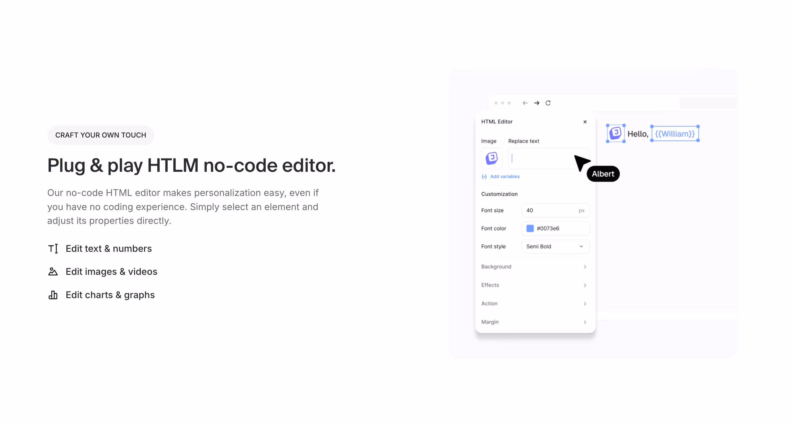 Personalize educational experiences in real-time using variables from CRM systems and other data sources. Customize text, visuals, charts, and embedded content to match individual prospect profiles, use cases, and company contexts without requiring custom educational content creation.