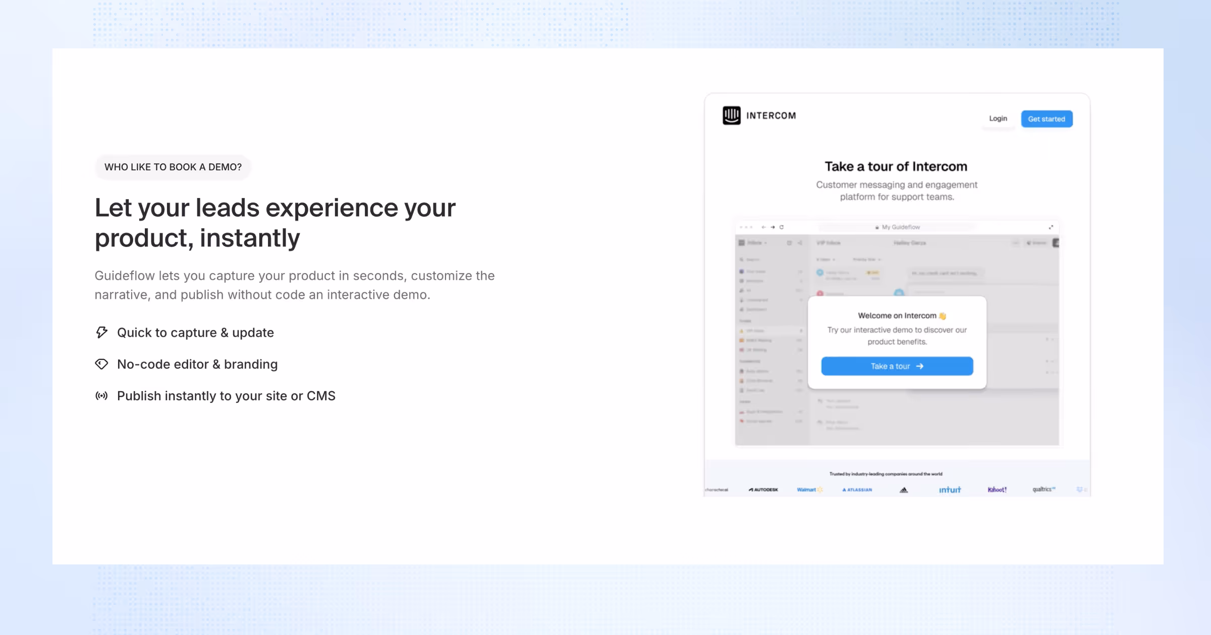 With platforms like Guideflow, the actual building process becomes straightforward. Capture your product flow directly from your browser, add contextual elements like calls-to-action and overlays, customize the design to match your brand, then embed, share, and track performance.