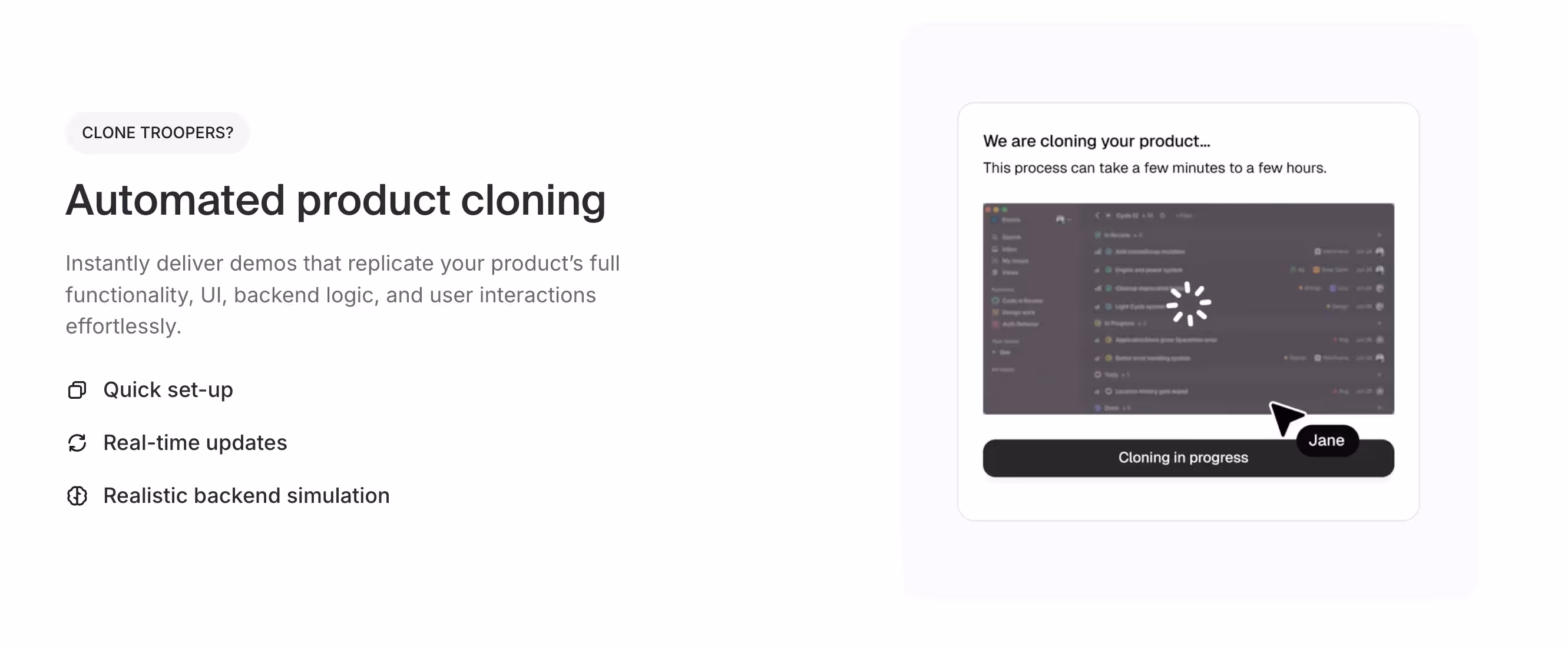 Instantly replicate your product's complete functionality, UI, backend logic, and user interactions without any coding or development resources. The system captures your entire product architecture and creates pixel-perfect demonstrations that feel identical to your live environment.