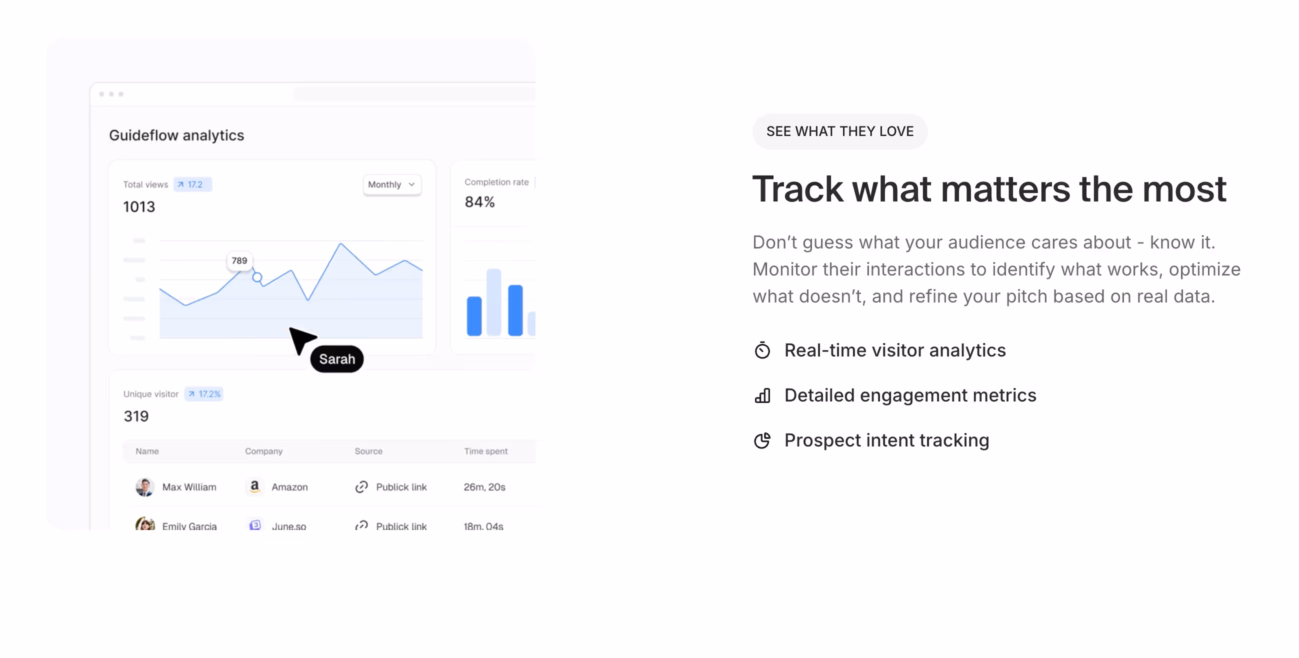 They support prospects throughout the evaluation journey while providing sales teams with embedded guidance and detailed insights.