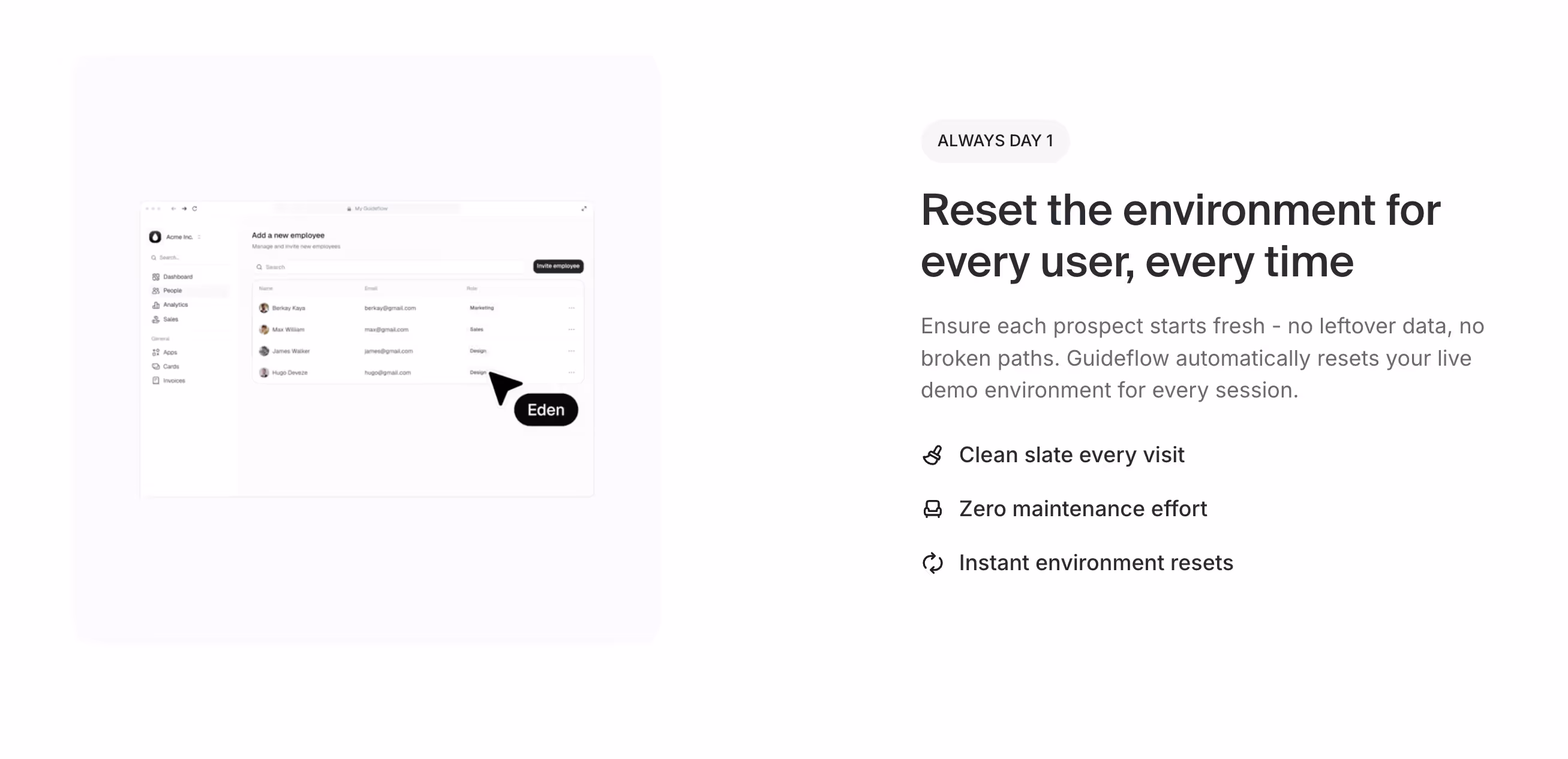 Automatically reset the demo environment for every user session, ensuring each prospect starts with a clean slate and optimal experience. No leftover data, broken workflows, or inconsistent states compromise the demonstration quality.