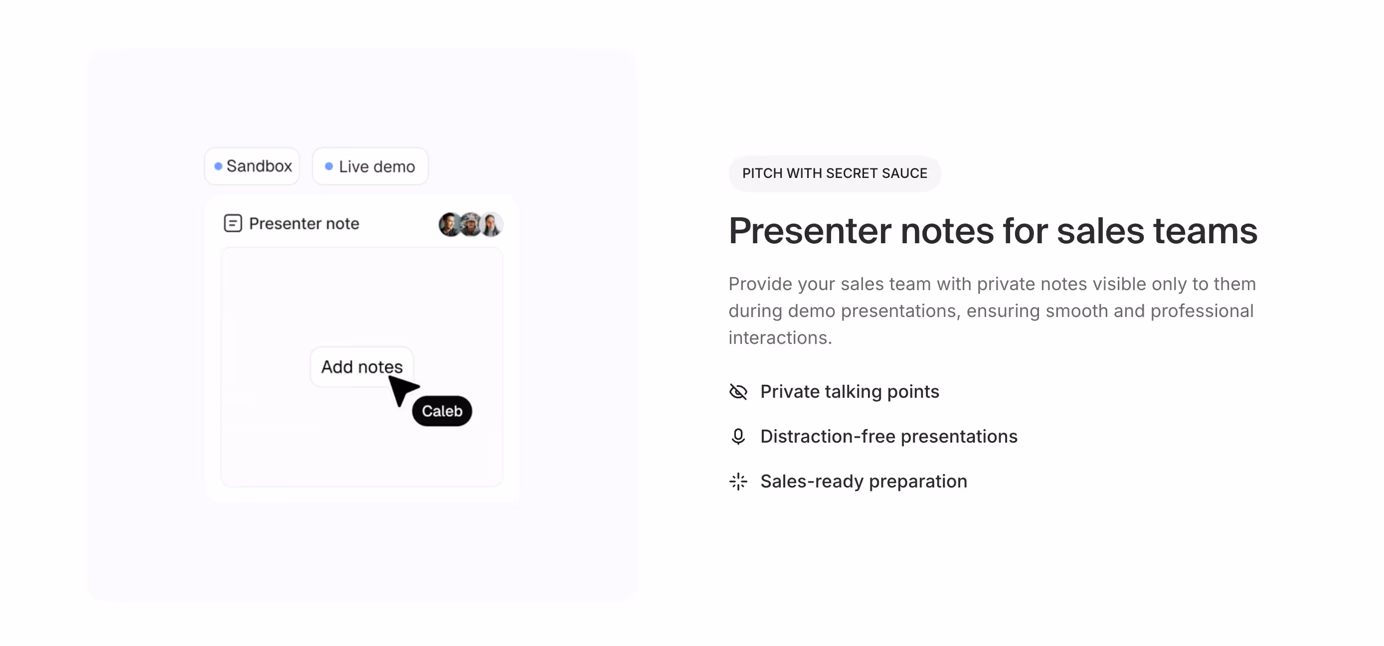 Provide sales teams with private notes visible only to them during demo presentations, ensuring smooth, professional interactions with consistent messaging and talking points.