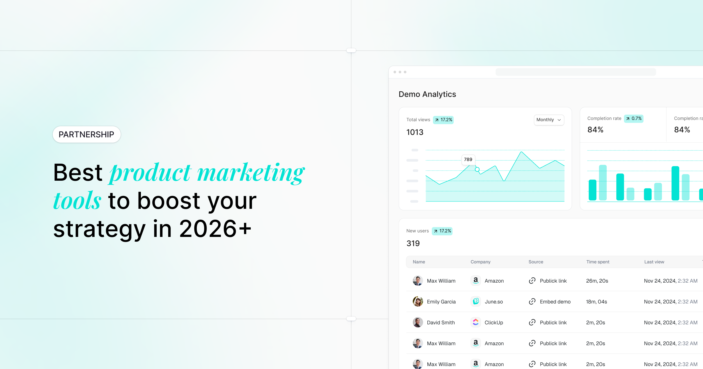 - Research and analytics: Survey tools, competitive intelligence platforms, product analytics dashboards
