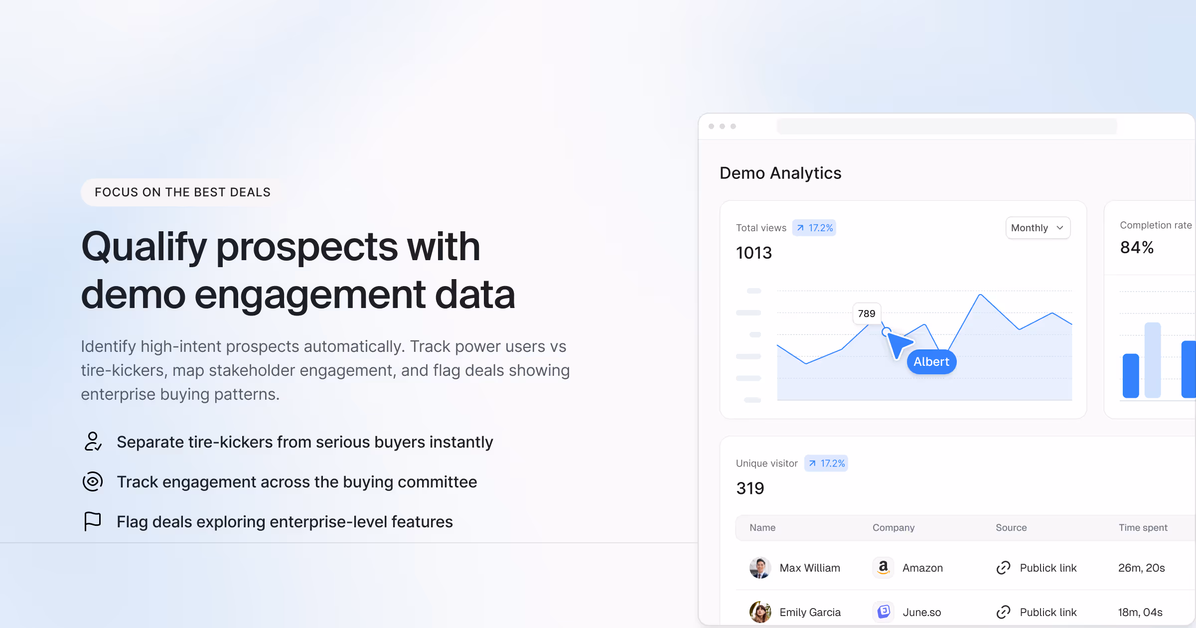 Data from enterprise SaaS companies shows average sales cycles reduce from 33 to 27 days when prospects access interactive demos before live meetings. The asynchronous nature means prospects in different time zones don't wait for your availability, maintaining momentum throughout their buying process.