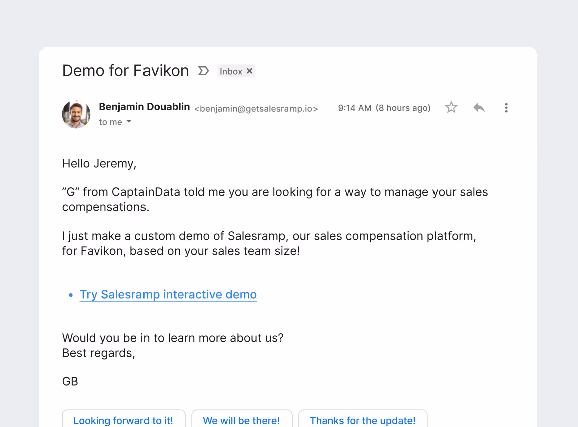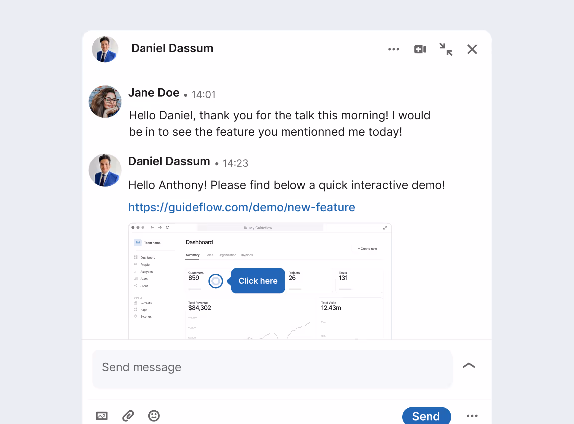 Enable your leads to interact with your product by embedding guideflows directly inside your outbound campaigns. Qualify the hottest opportunities and book more demos. Don't let your leads wait days anymore.